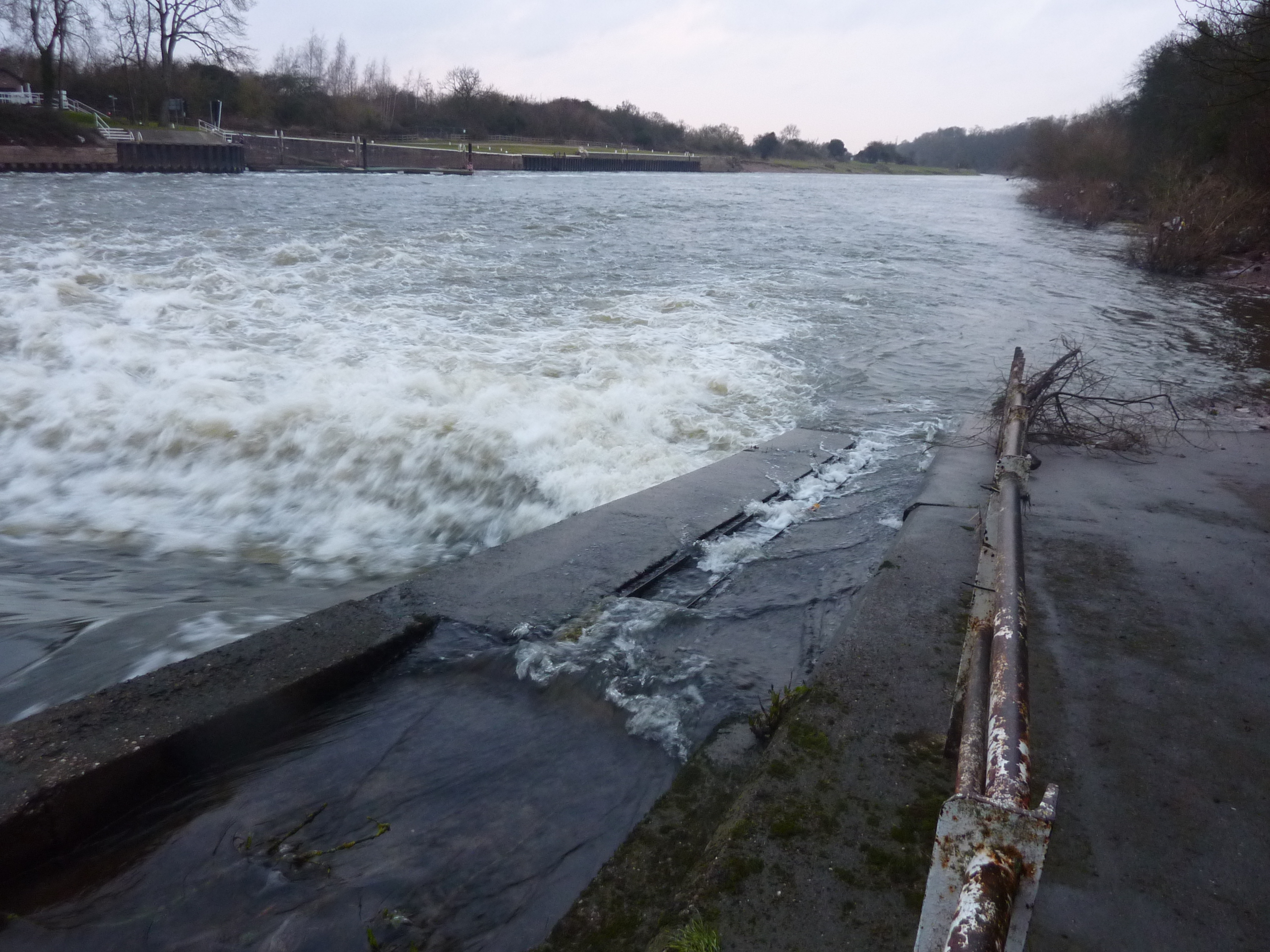 About 100 yards downstream is a nice exposure of the Mercia mudstone, with its layers of white gypsum, alongside Gunthorpe weir. In medium water a canoeist could slip past the barrage and line down the fish pass. But don’t shoot the weir!