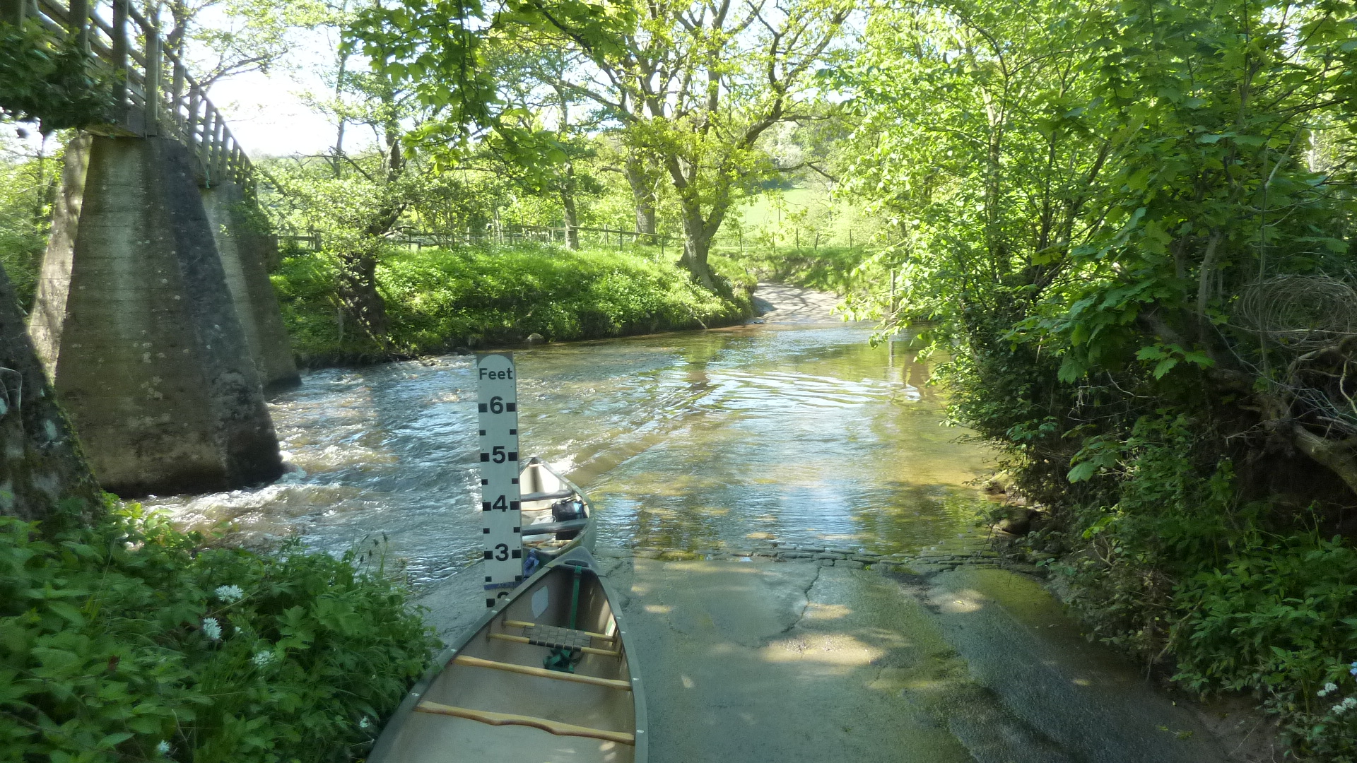 Commercial tours chuck in from the left bank about midway between Sleights and Ruswarp, but it’s a better day’s paddle in an open canoe from Grosmont. High water avoid. Medium water grade 1-2. In summer a lot of scraping. According to canoedaysout.com, access is disputed, but that’s mainly higher up. There’s not too much trouble below Grosmont. In May 2013 a fisherman grumbled that “The rivers public but the banks are private” when we got out to inspect the 1/4 mile weir. But below that the land is National Trust at least for a bit.
