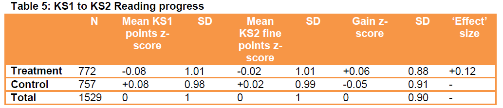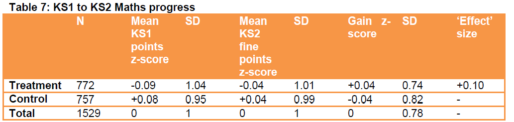 The evaluators judged that the groups were well balanced at baseline, on the basis of table 4 (baseline characteristics) in the report. But they ignored, or did not notice, the baseline imbalance of nearly 0.2 SD in KS1 reading and mathematics (total KS1 baseline scores are not reported) and of between 0.05 and 0.1 SD in CAT score. We can forgive the evaluators because these imbalances are not reported in table 4. They appear in the third columns of tables 5, 7 and 11 in the main report.