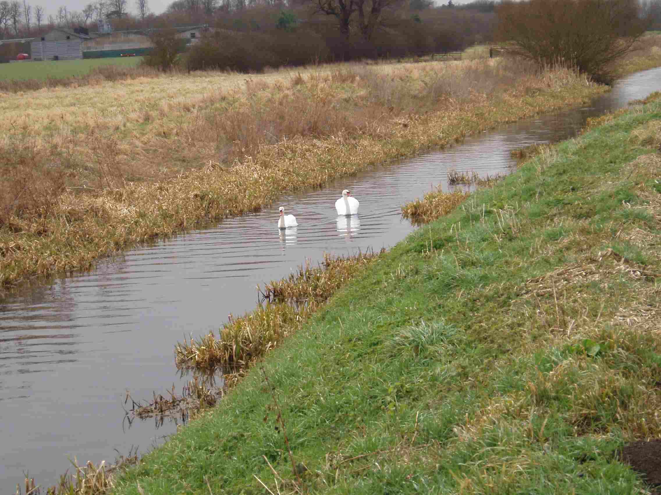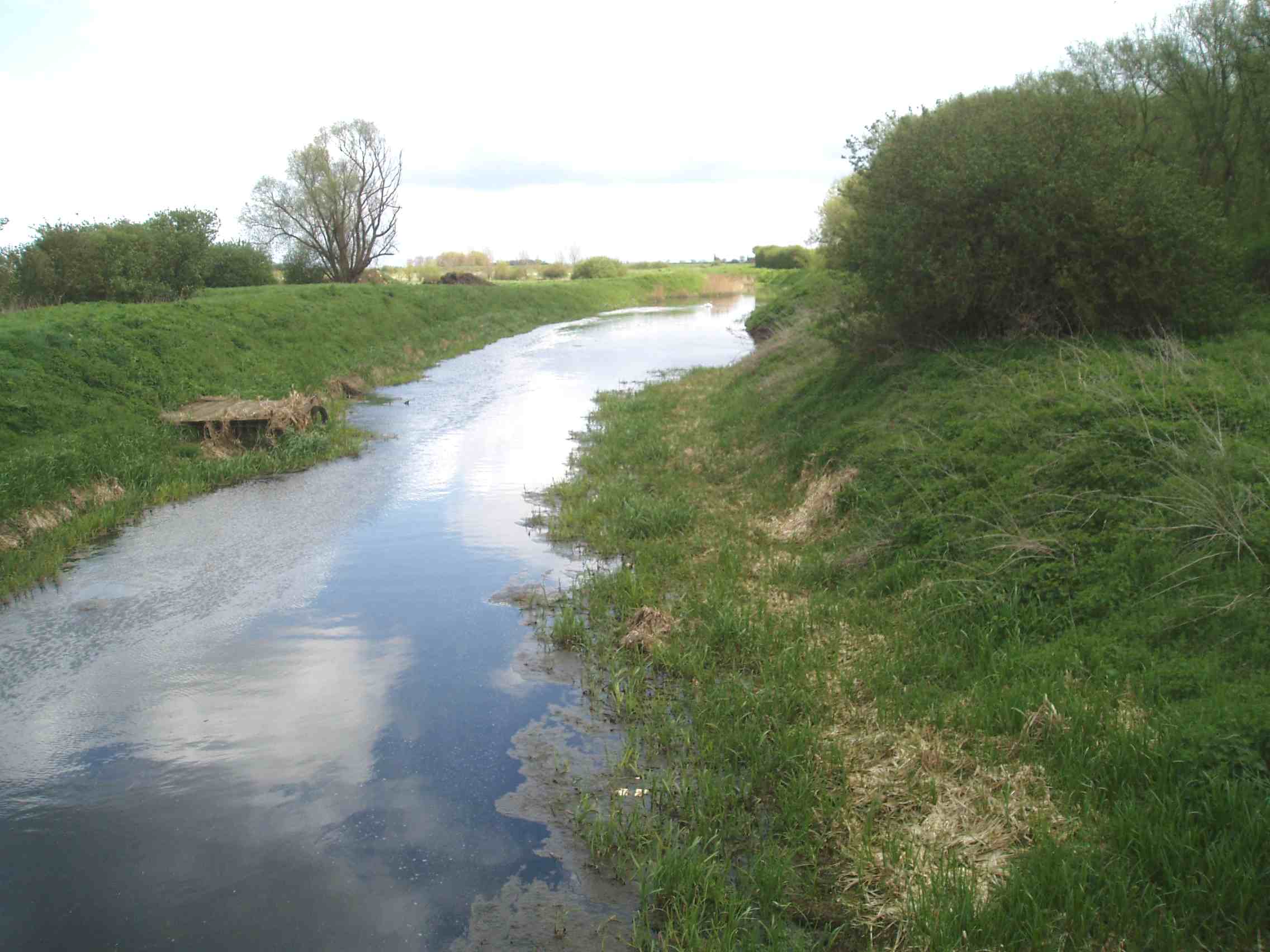The river turns northwards. High embankments in open farmland.