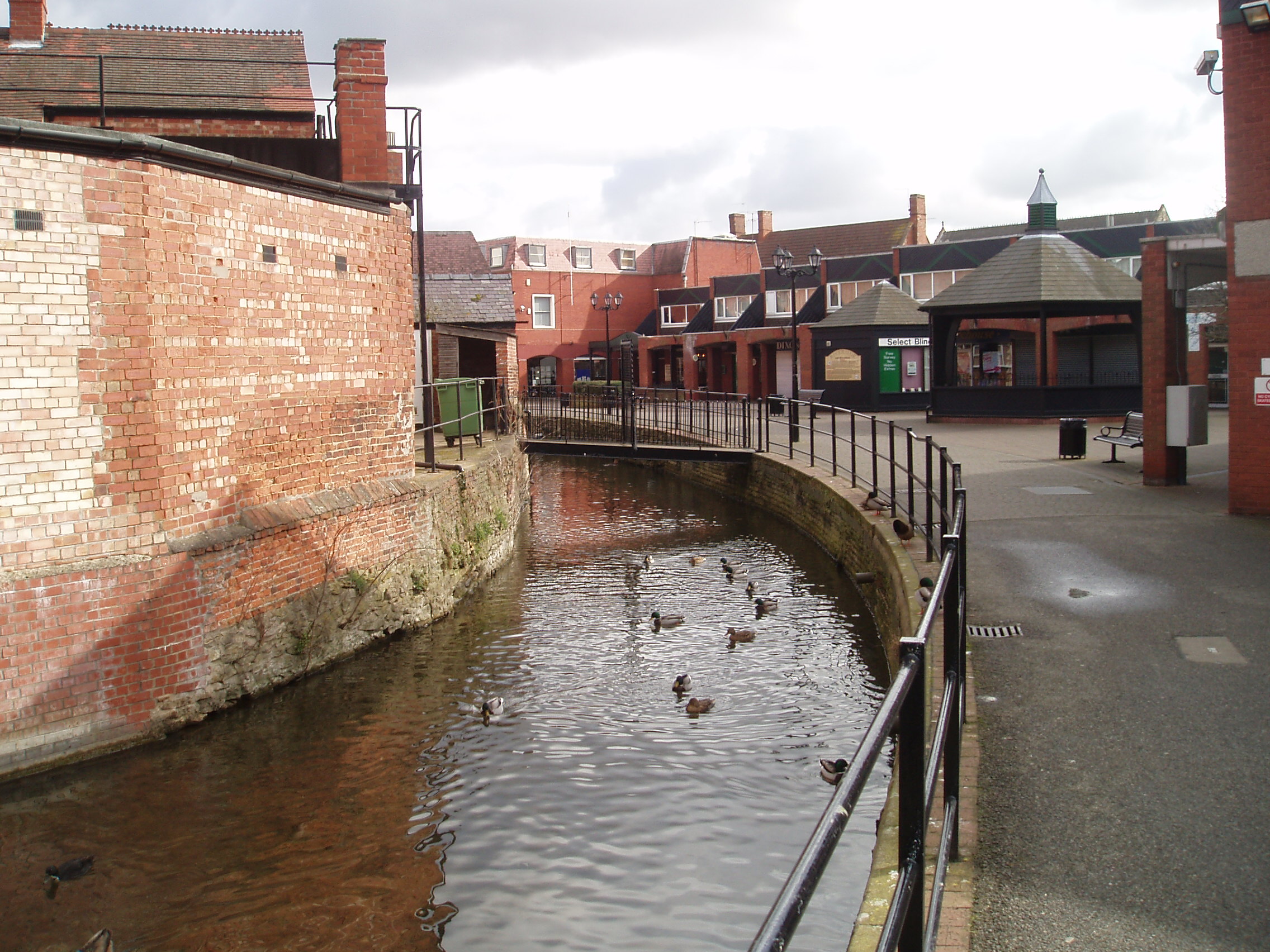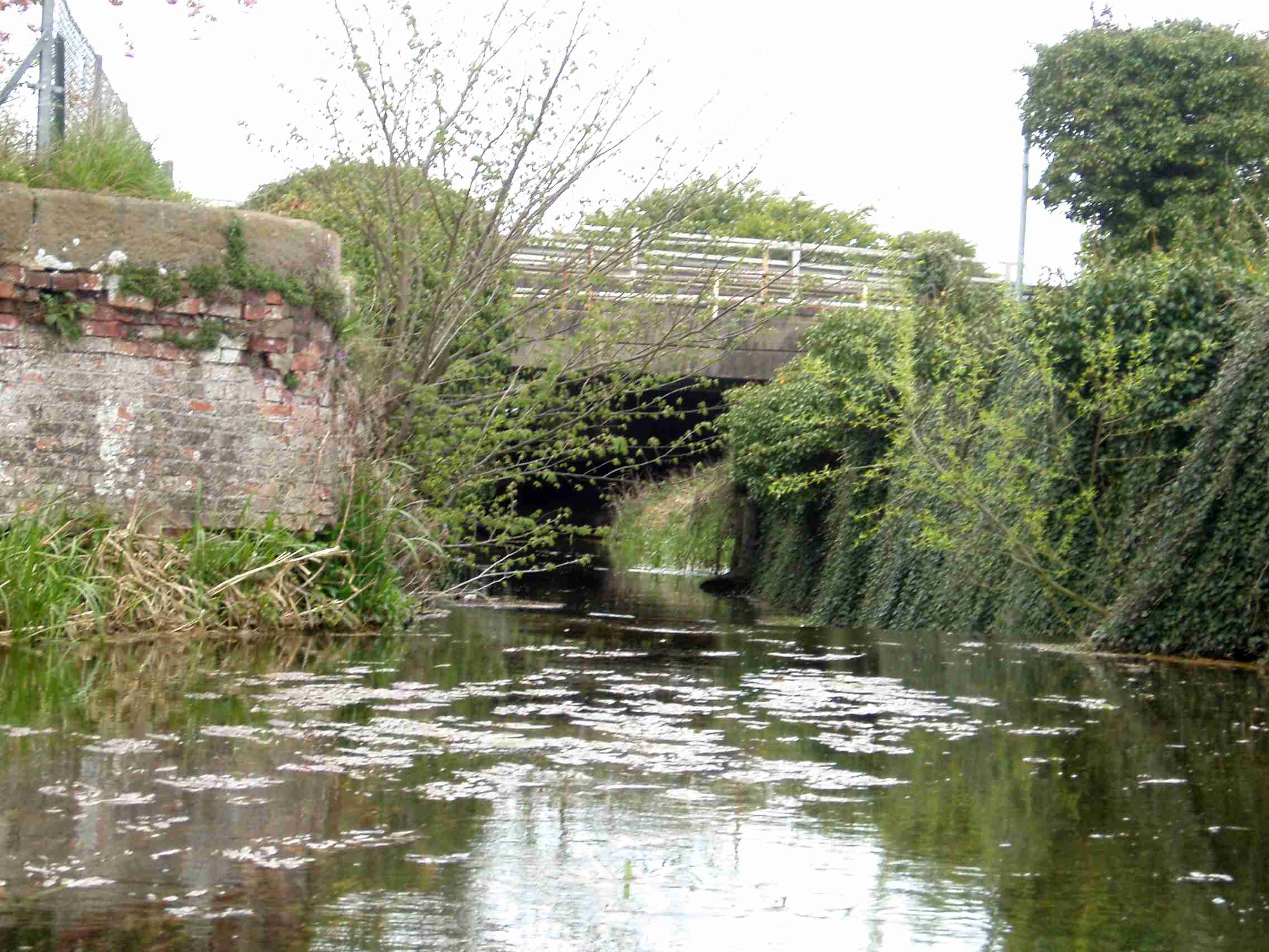 Impassable little weir under low footbridge just below the shopping centre. The upper part of the old navigation looks inviting too, but is not connected downstream.