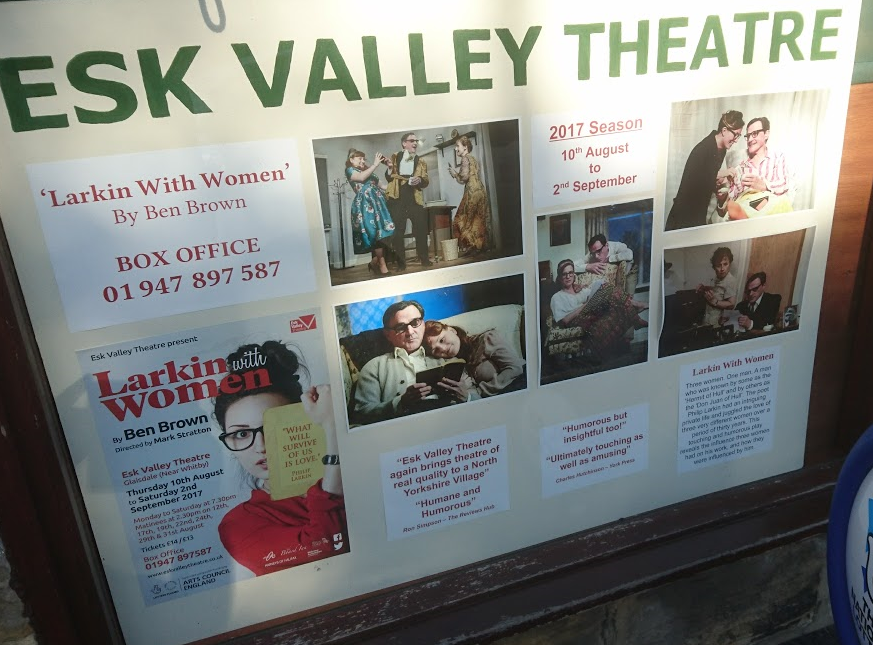 We had popped in before the show to look around the empty theatre, and one of the scene shifters had told us its story. Esk Valley Theatre has been running ten years – Willy Russell’s Educating Rita last year – with minimal subsidy but much local volunteering. The company bring their own seating and put on one production annually. They have some connection with Scarborough where Alan Ayckbourn tries out most of his plays; Larkin with Women was first performed there in 1999, and Ayckbourn himself had turned up in the audience the previous night.