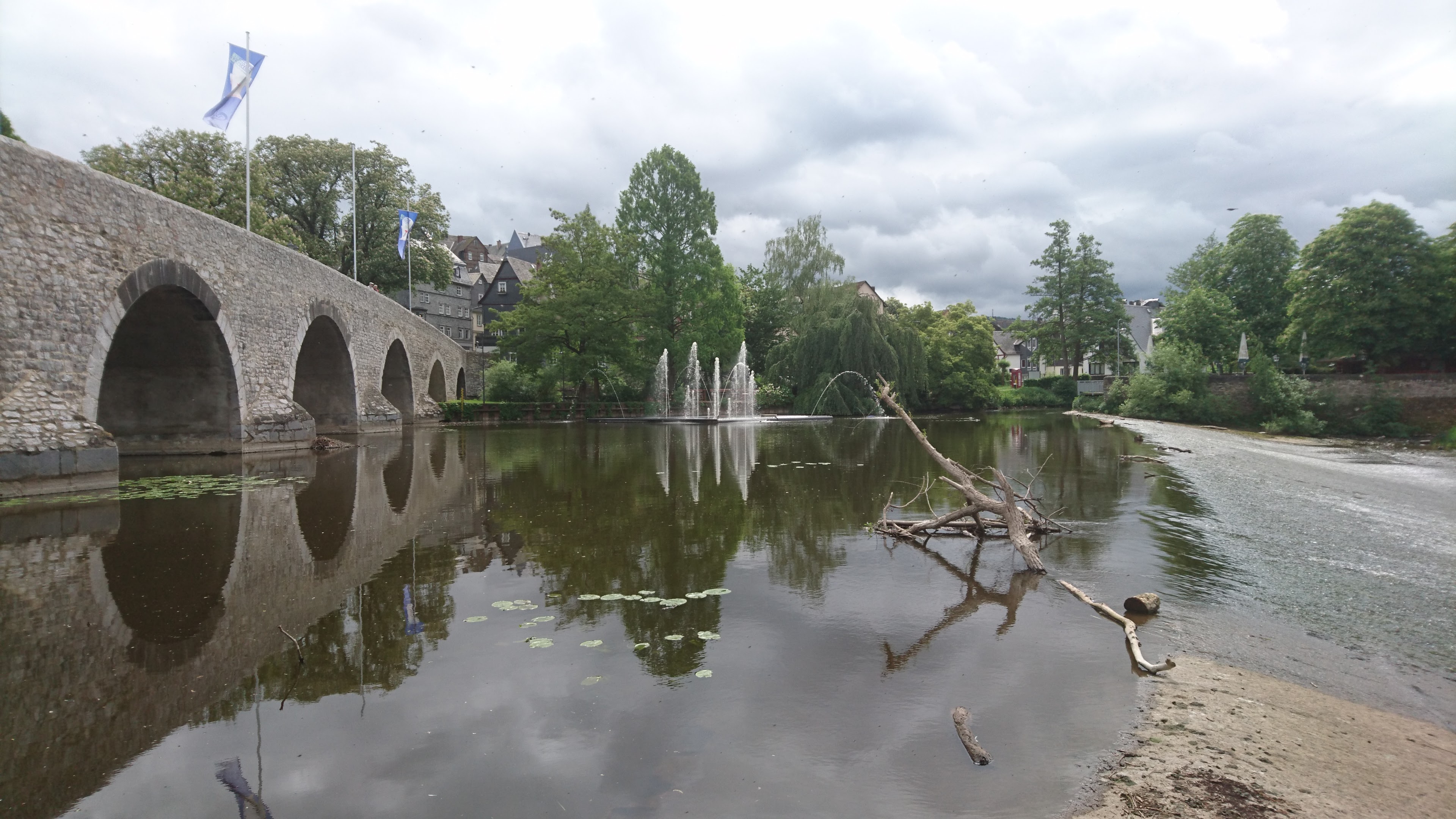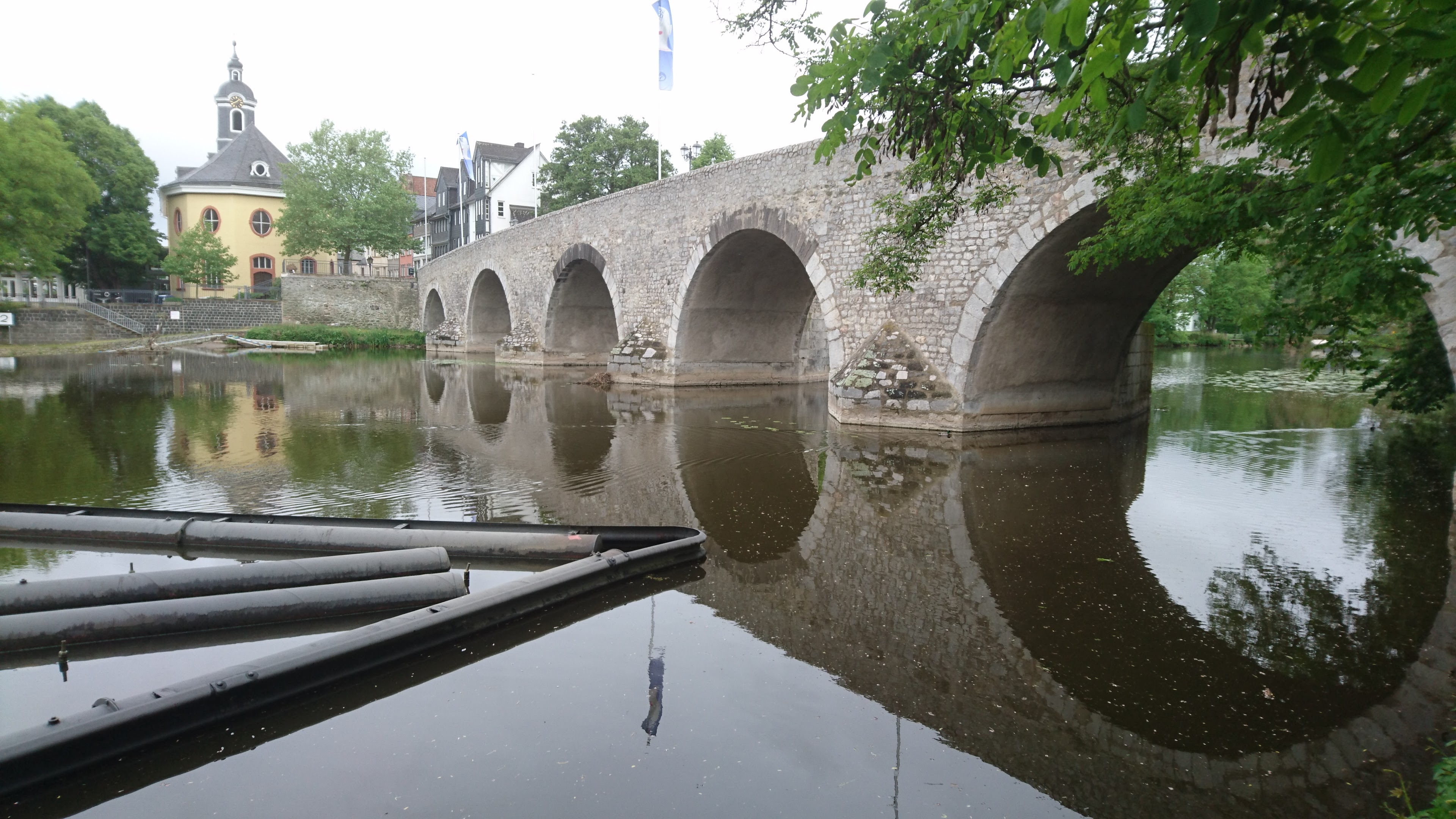 The distance boards on the bank measure from the historic border between Prussia and Nassau, a few km downstream of Giessen, but the river is canoeable from Marburg, 37 km above that point.