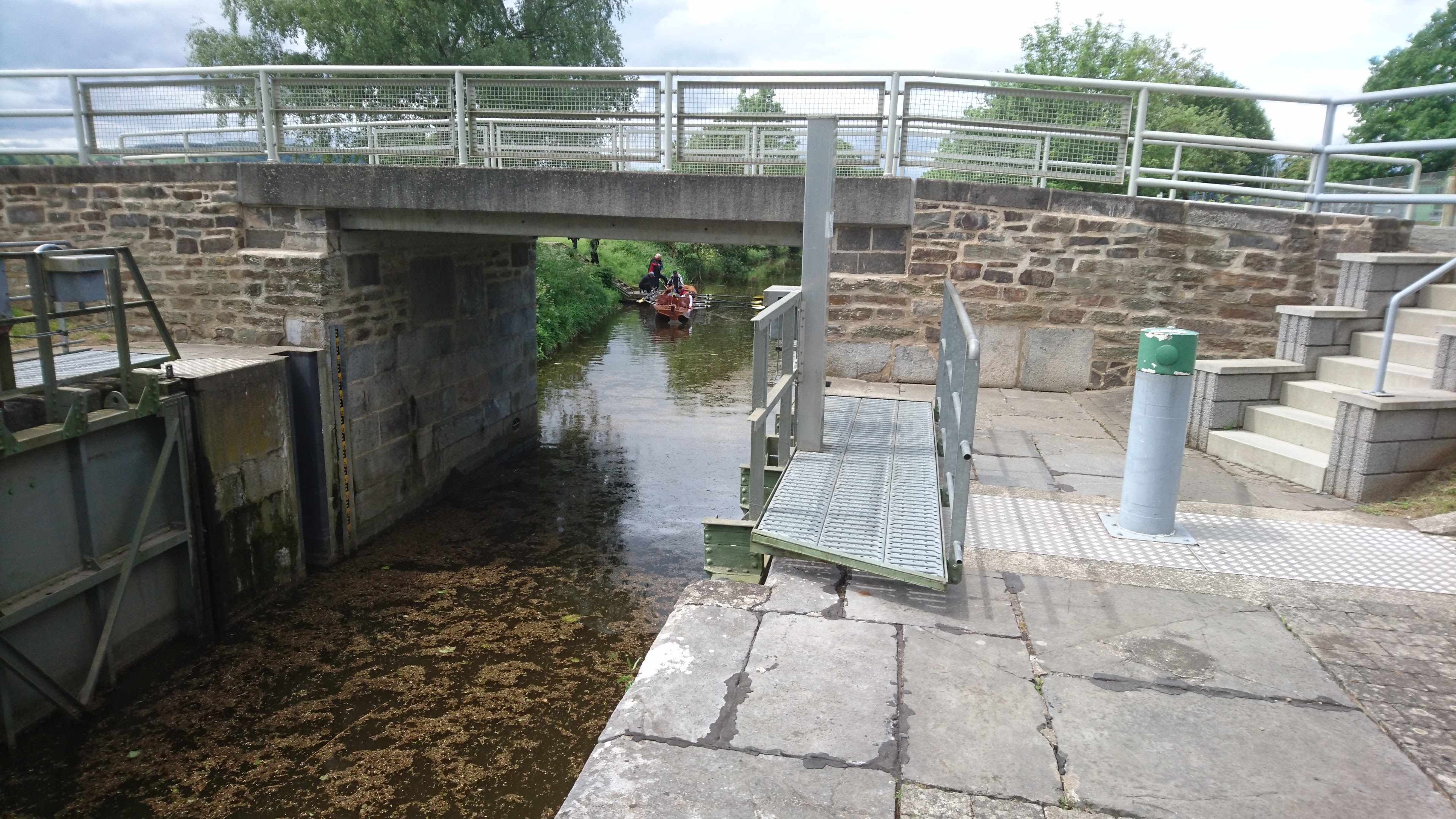 39.7 km – Weilburg tunnel left. The distance markers on the bank follow the main river course. So you save about 2km paddling distance by going through the tunnel. The tunnel is large and airy and about 200 metres long. The far end is visible as soon as you enter, albeit partially obscured by the lock gate at the exit. There is no landing stage above the lock so you have to climb directly up a metal ladder to work the gates. Fine for two in an open canoe but would be tricky for a single person in a kayak.