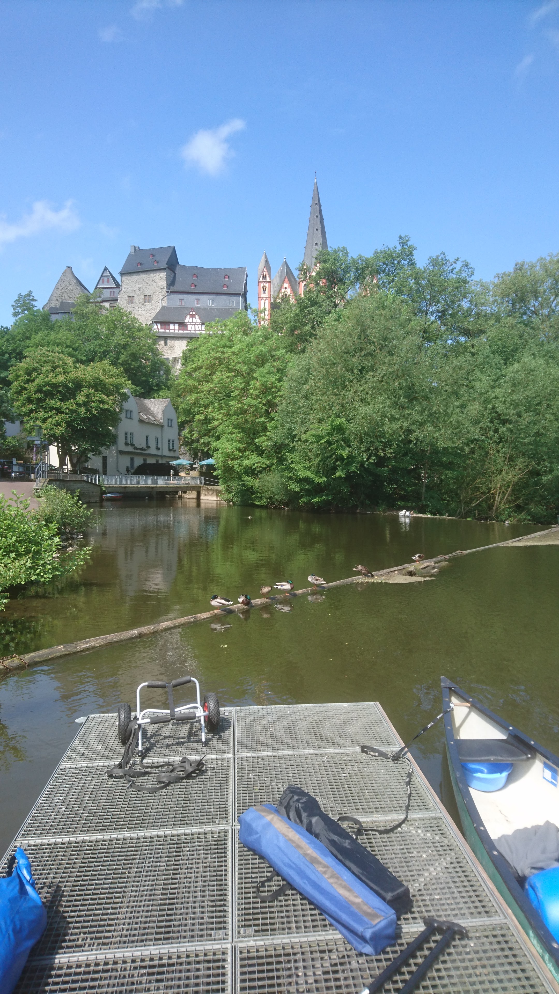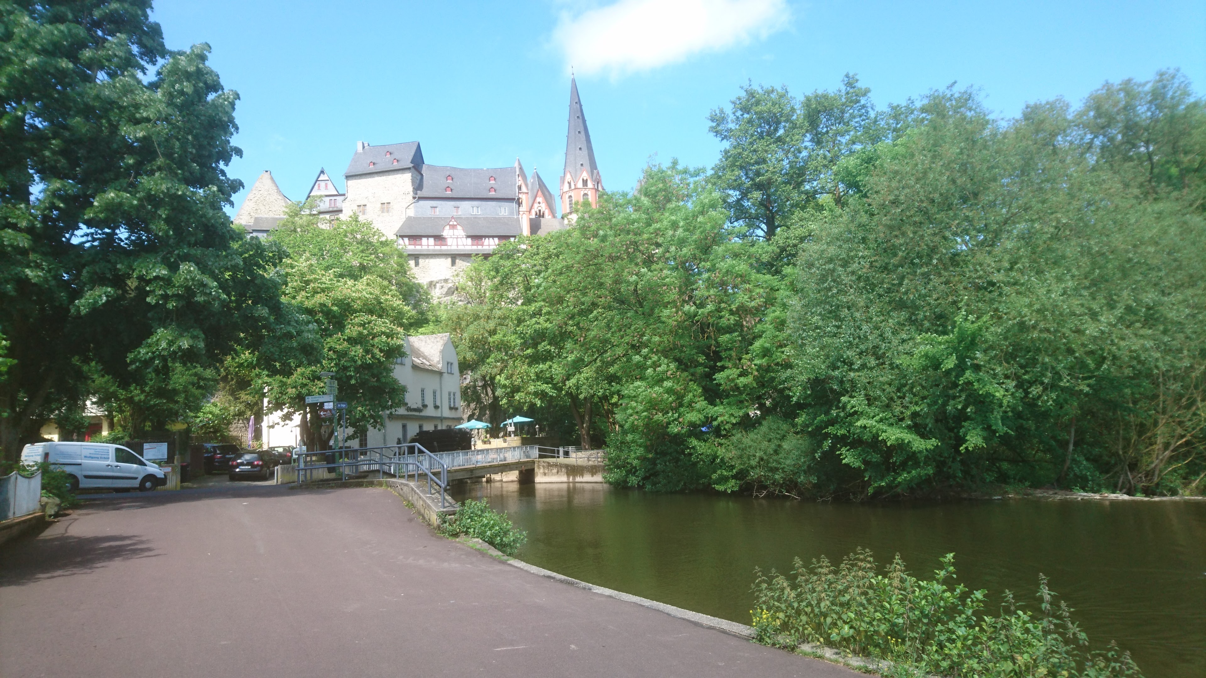 Ignore main channel under 456 road bridge to weir, castle, old Lahn bridge. Beyond that steel footbridge