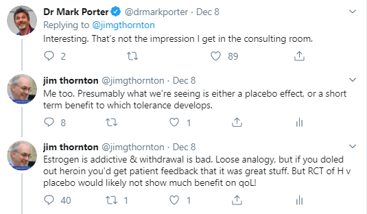 Me: “Estrogen is addictive & withdrawal is bad. Loose analogy, but if you doled out heroin you’d get patient feedback that it was great stuff. But RCT of H v placebo would likely not show much benefit on qoL!”.