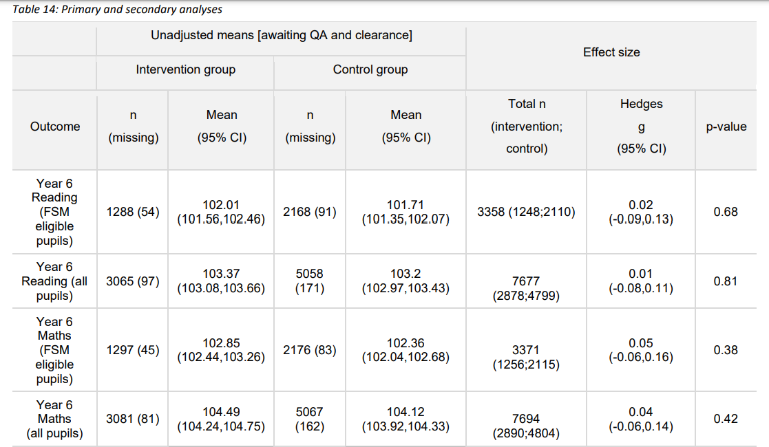 The report is 125 pages long, and a turgid read, – education researchers love making simple things complicated – but the essence is easy to describe. There is a CONSORT flow diagram (Fig 1, p33 not shown here), few pupils were lost to follow-up (Table 12, p36 not shown here), and the randomisation achieved a balance of both schools and pupils at baseline (Table 13, p37 not shown here). The primary and main secondary outcomes are in Table 14, p38 (click on thumbnail to read).